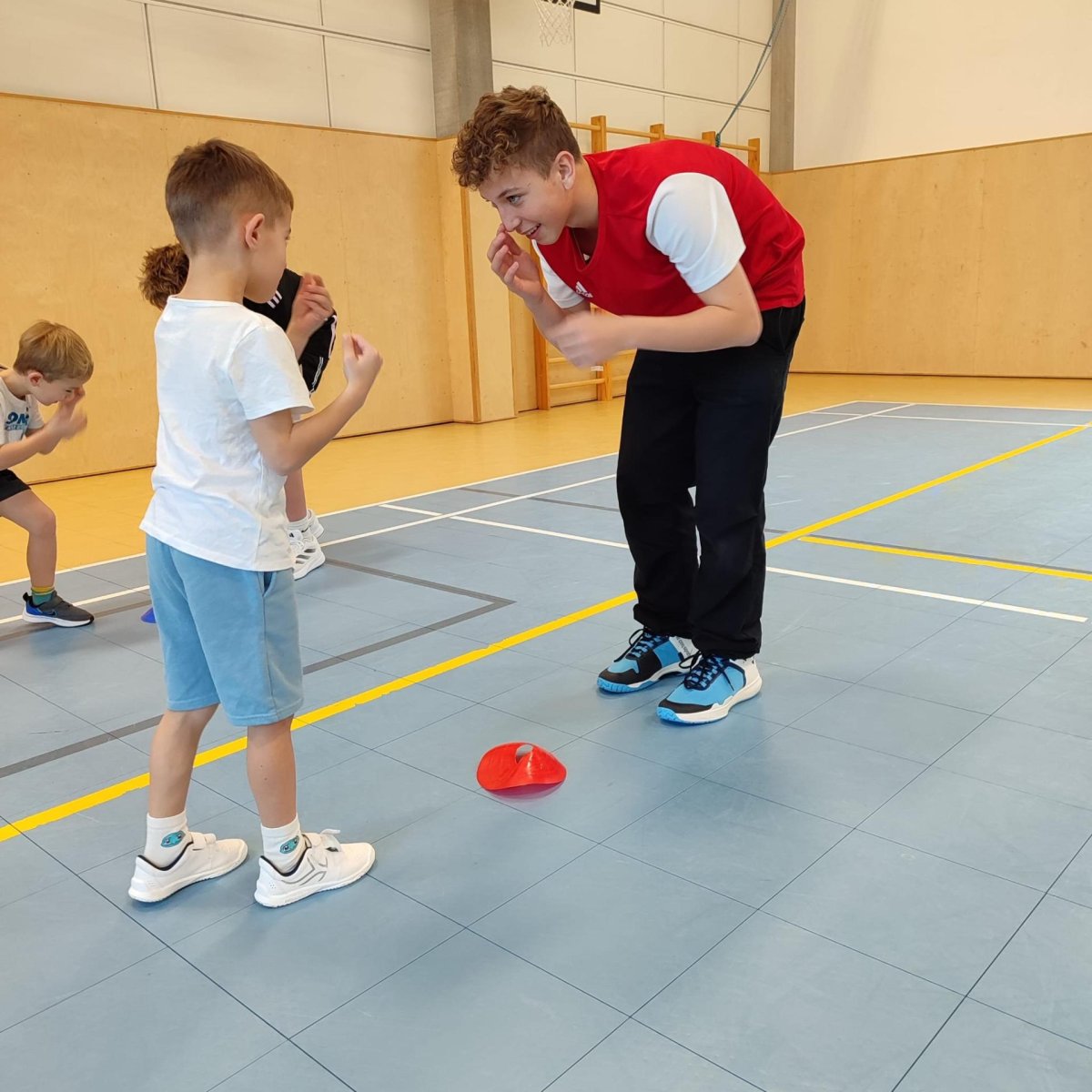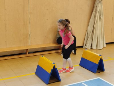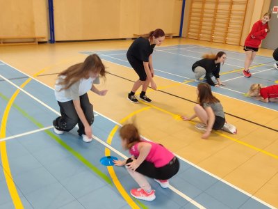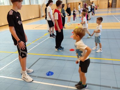 Deváťáci učili prvňáčky tělocvik