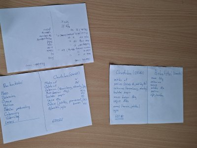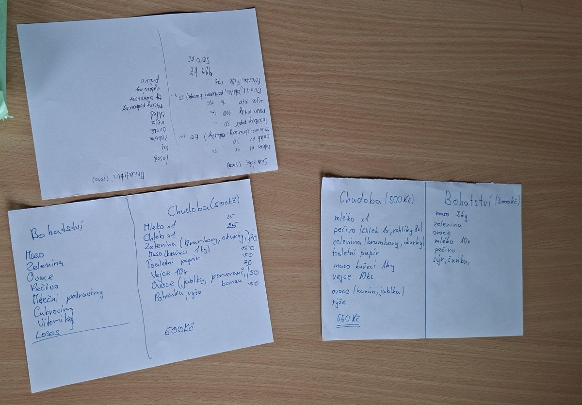 Každá skupina dostala na začátku fiktivní sumu peněz (500Kč nebo 2000Kč), která měla pokrýt nákupy potravin na sedm dní. Žáci si nejprve museli naplánovat jídelníček, zamyslet se nad nutnými surovinami a rozpočtem. Poté procházeli letáky a vytvářeli nákupní seznam tak, aby jim peníze vystačily na celý týden.
