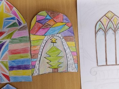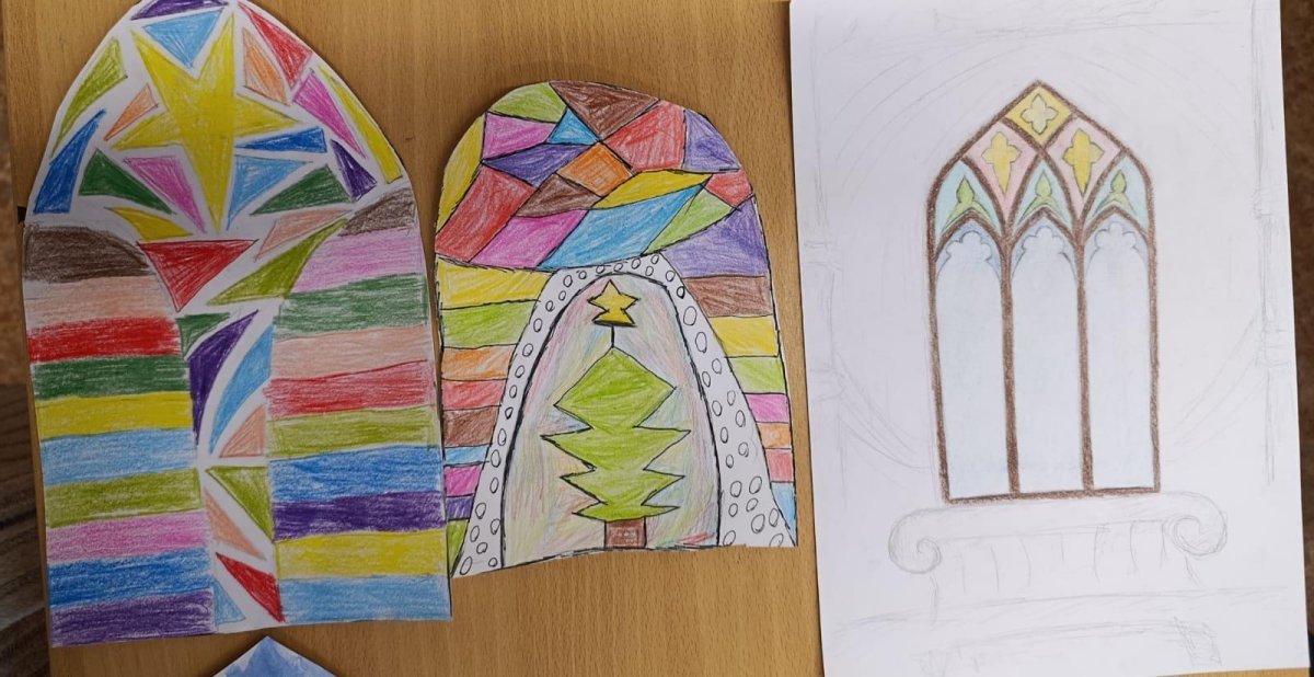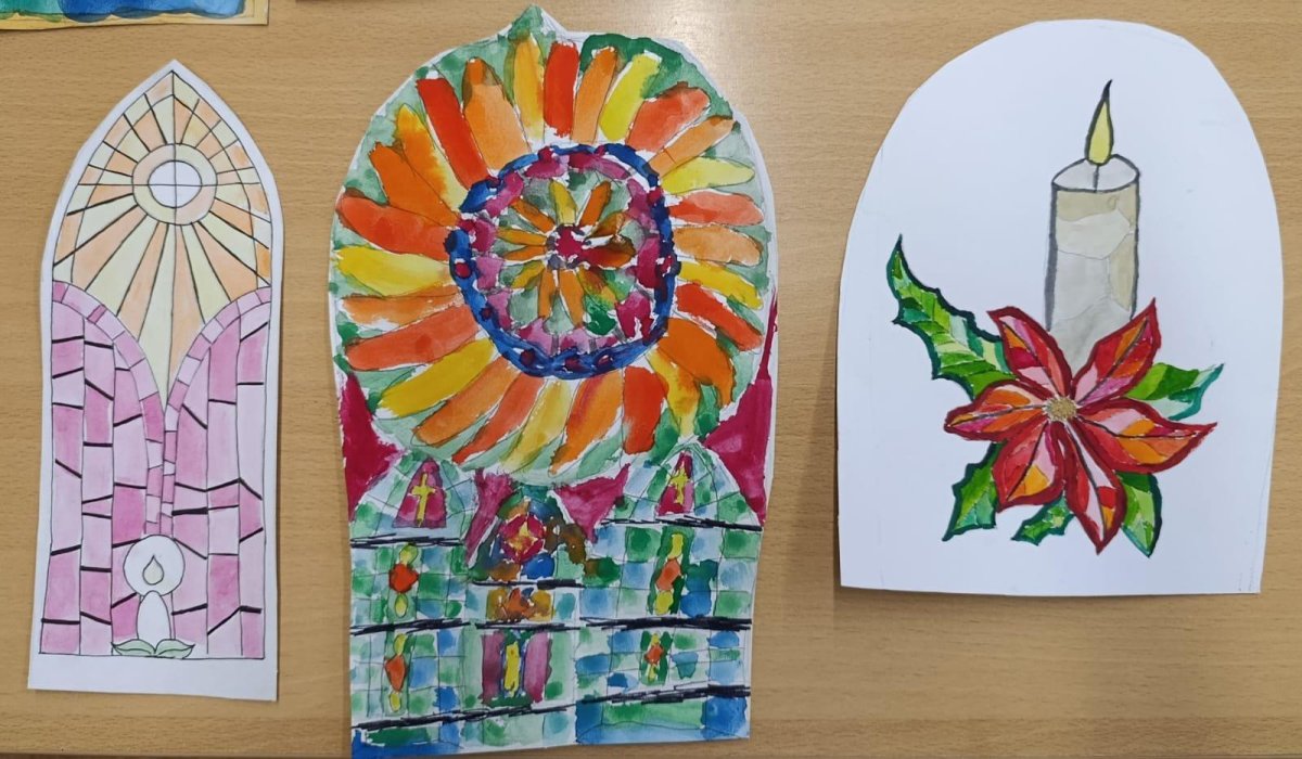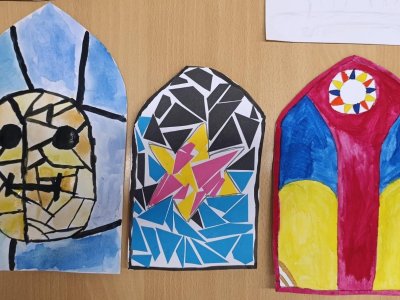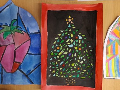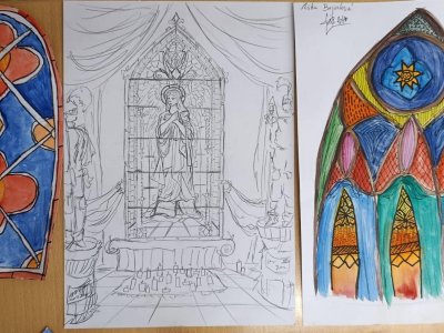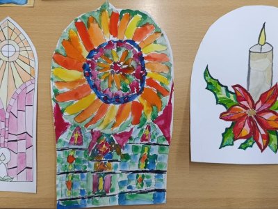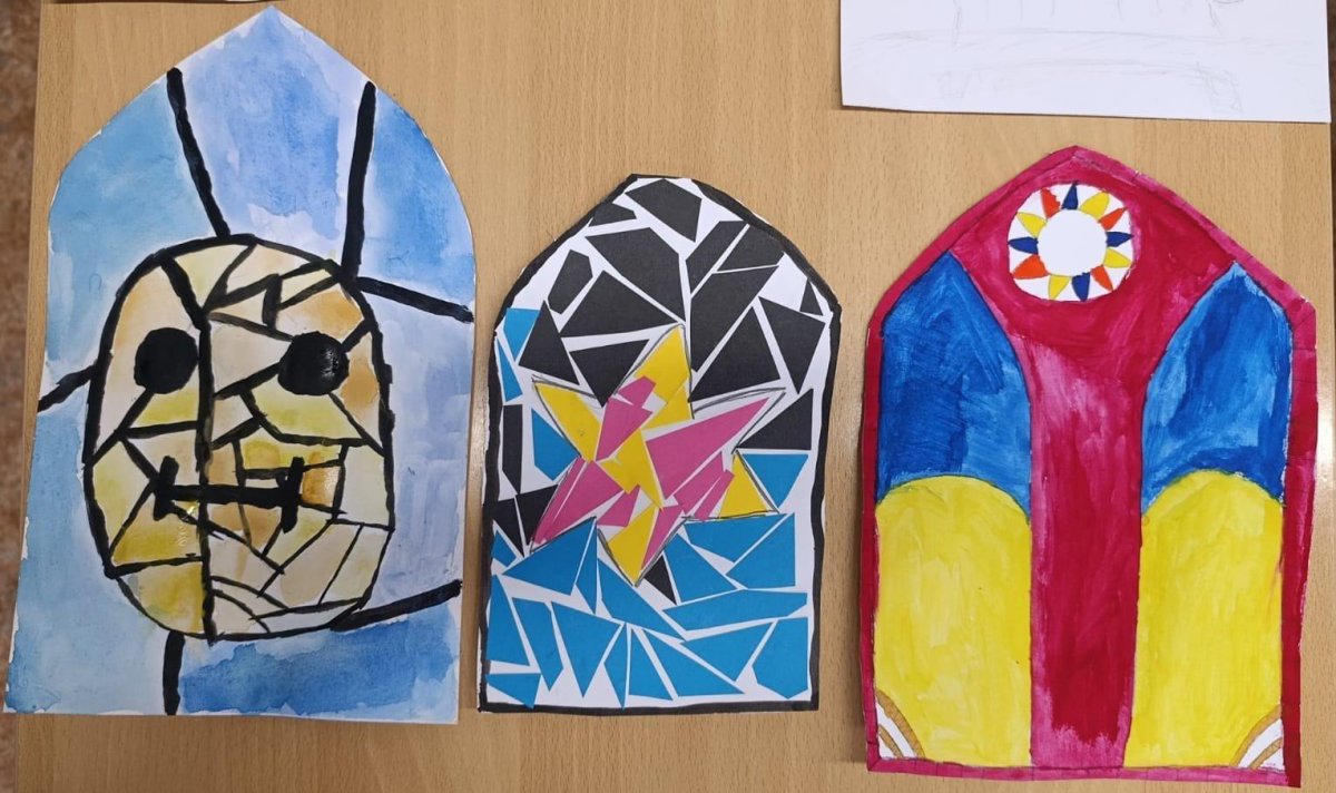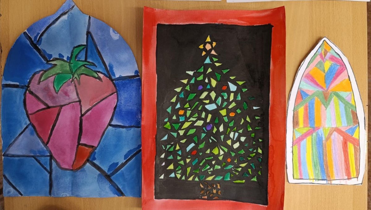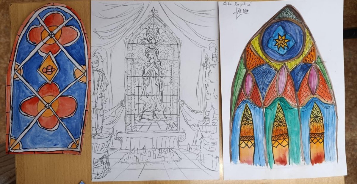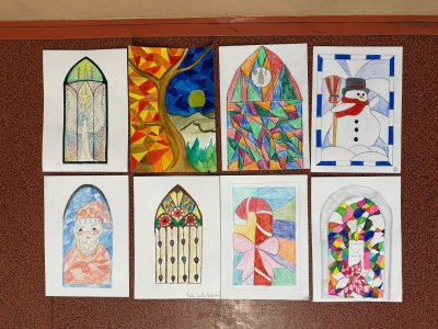 Žáci 8. ročníků se v hodinách výtvarné výchovy věnovali tradičním výtvarným tématům – mozaice a vitráži.