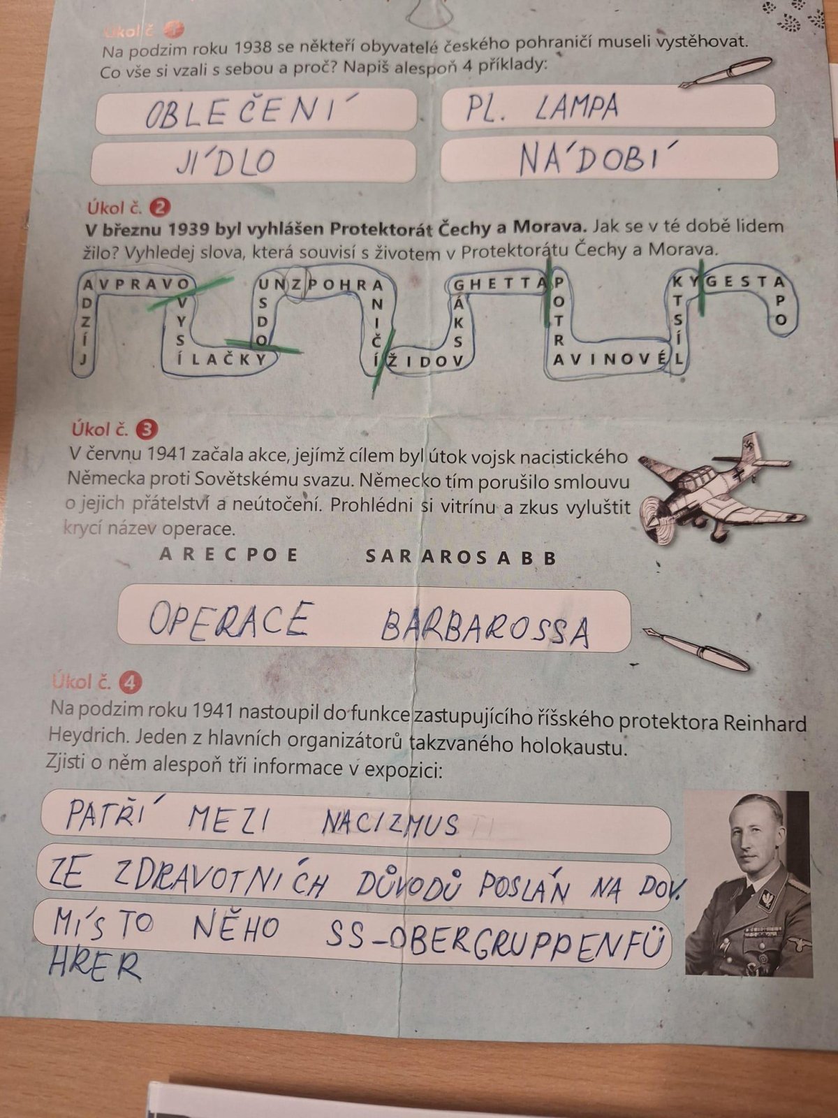 Muzeum je nově otevřeno po rekonstrukci, která se moc povedla. Nejprve jsme šli do malého kinosálu, kde nás lektorka uvedla do děje příběhu o našich parašutistech za 2. světové války. Žáci se rozdělili do skupin a dostali pracovní listy. Pak si sami procházeli expozicí, četli, prohlíželi, fotografovali a vyplňovali. Asi po dvou hodinách se práce vyhodnotily. Podle reakcí žáků jsme poznali, že se jim v muzeu líbilo. Pracovali se zaujetím, všechny pracovní listy byly správně vyplněny. Ještě nakoupit v obchůdku nějaký suvenýr a někdy příště zase na shledanou.