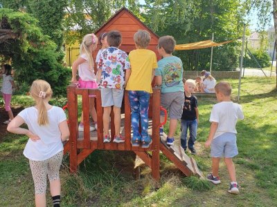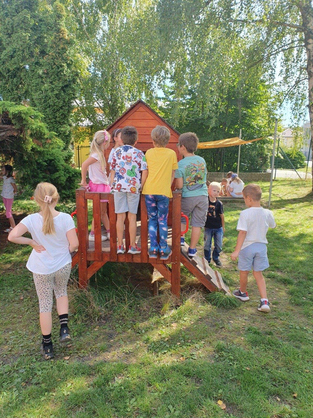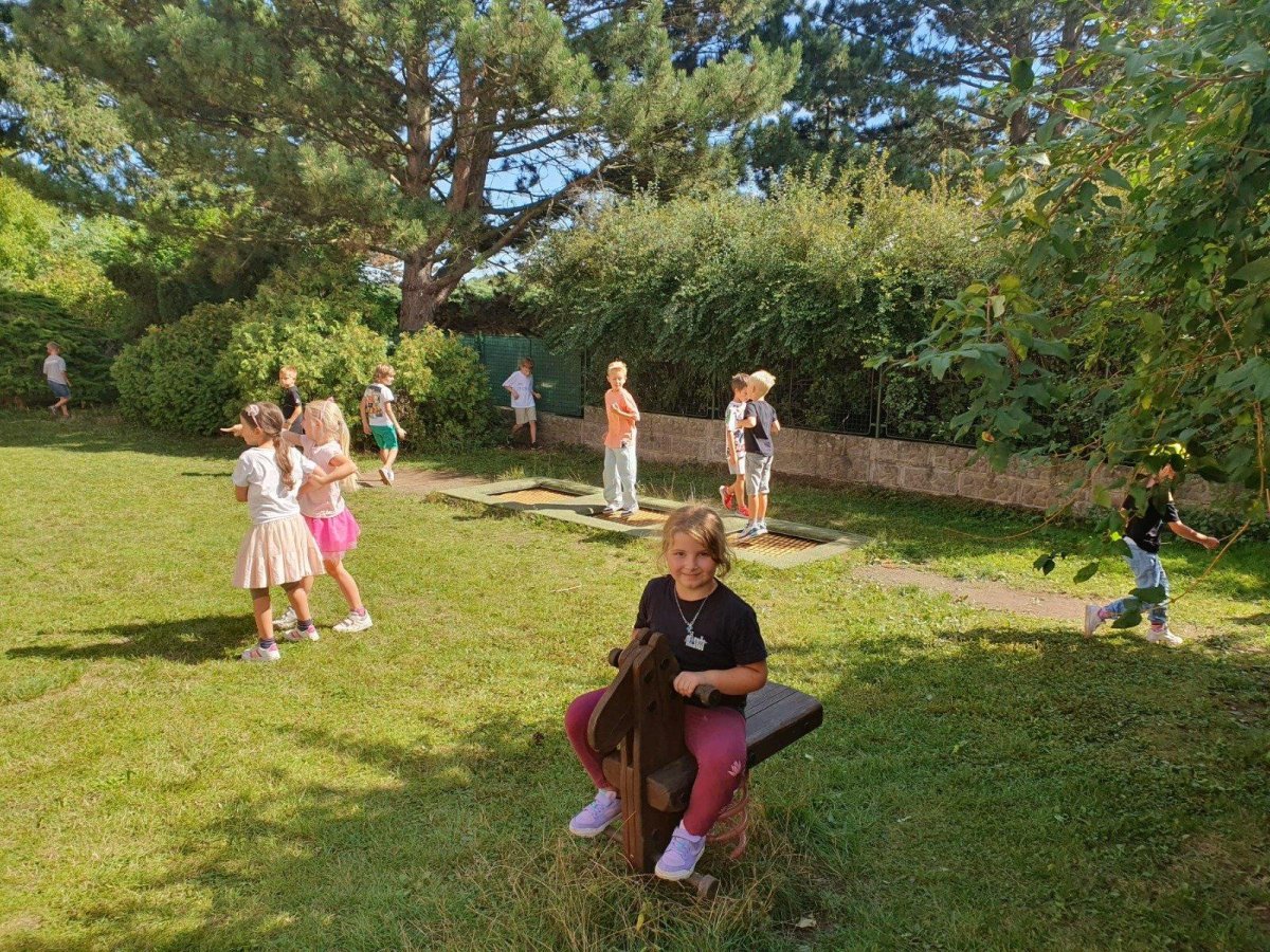 Po prázdninách se děti znovu setkaly se svými kamarády a společně si užívají krásné zářijové počasí na naší školní zahradě.