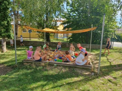 Děti tráví odpoledne venku a hrají pohybové hry, využívají herní prvky, pískoviště, tvoří z přírodnin