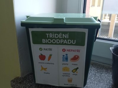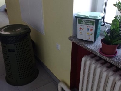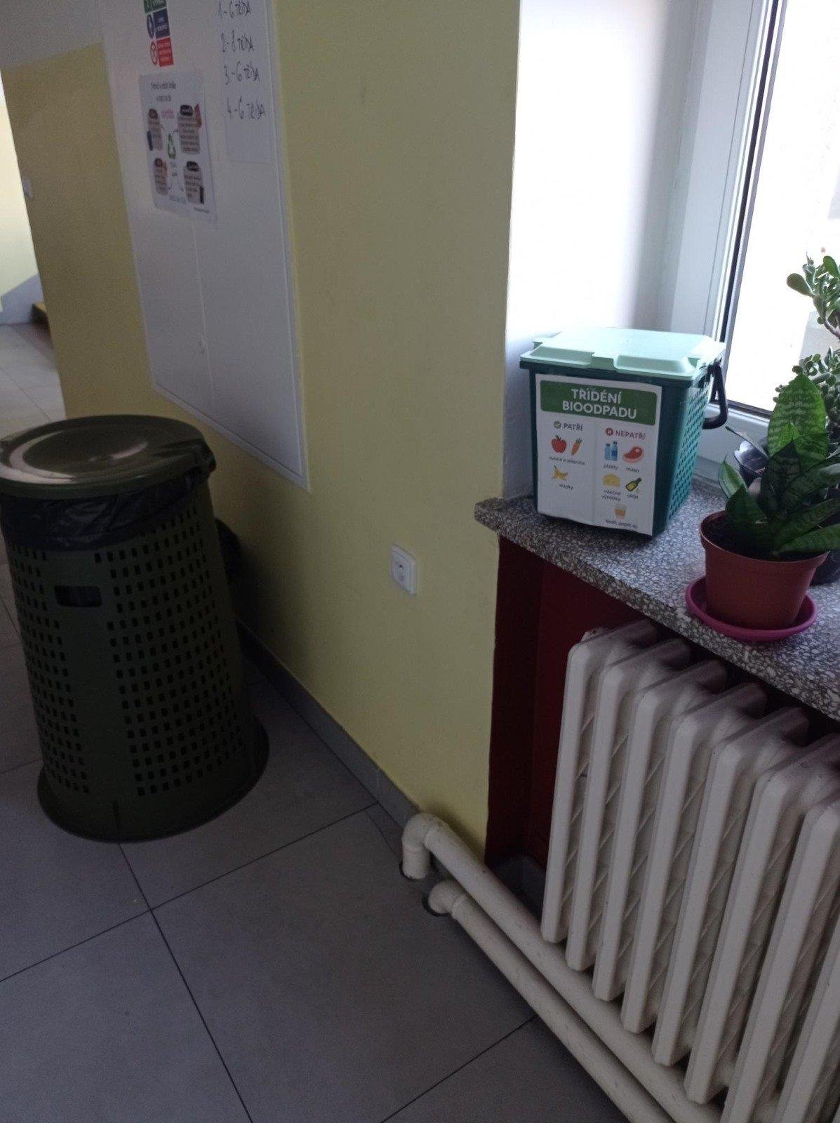 Na druhém stupni mohou žáci nově využívat koše na bioodpad, které jsou umístěné na chodbách v každém patře.