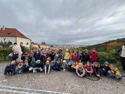Po výstavě jsme se vydali na krátkou procházku k vyhlídce na Prahu. Sluníčko nám v tu chvíli přálo, a tak jsme si společně udělali krásnou památeční fotografii s pohledem na celé město. Děti byly nadšené – nejen z výletu samotného, ale i z pocitu, že za svou píli a snahu ve škole dostaly první „odměnu“.