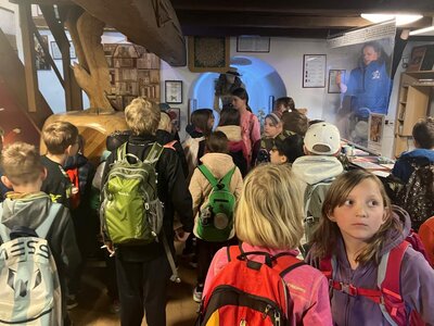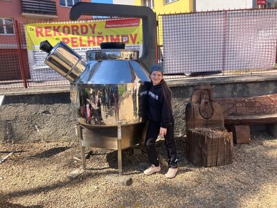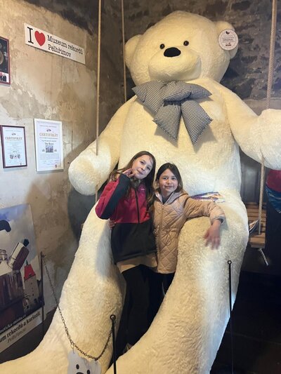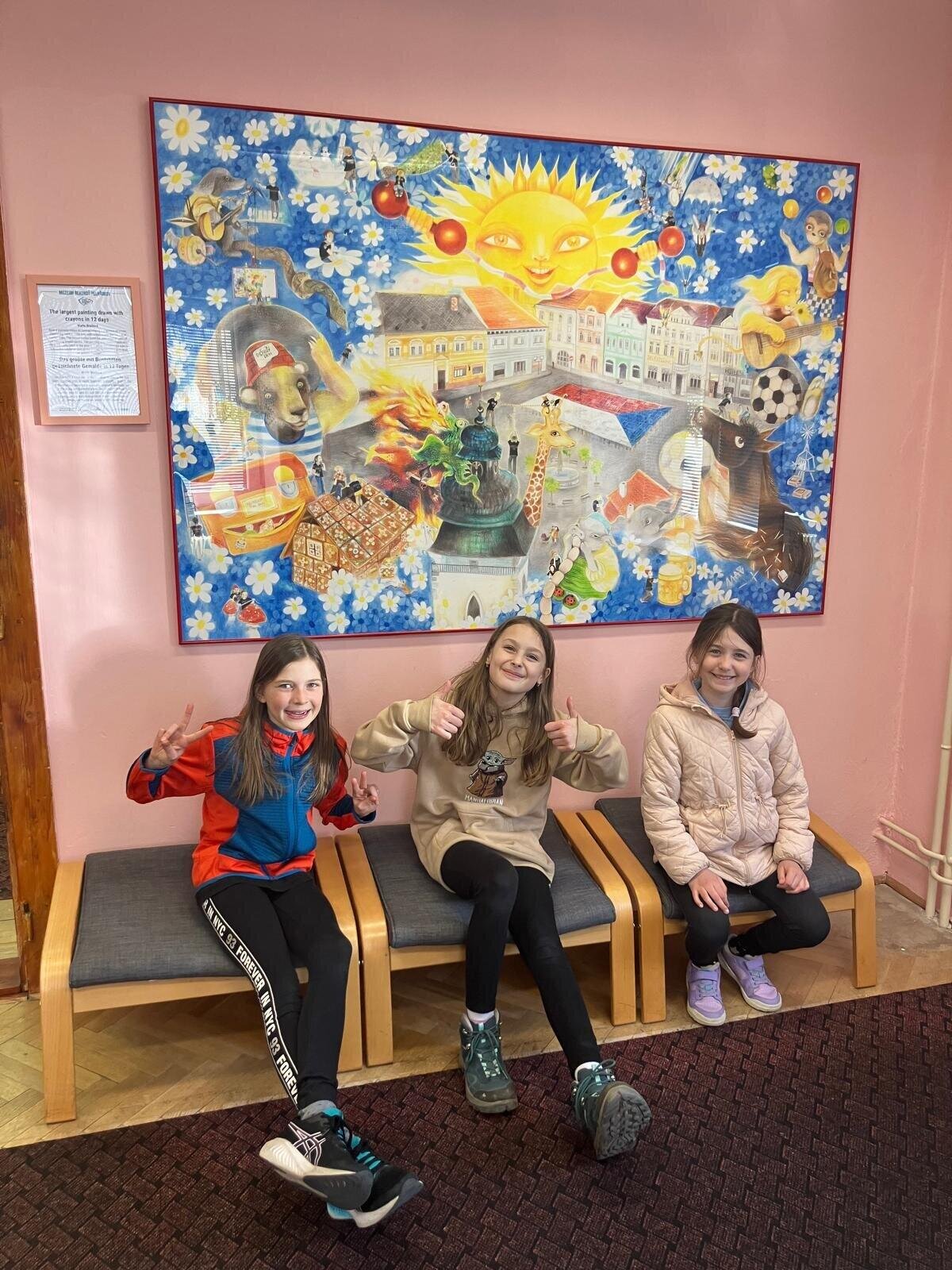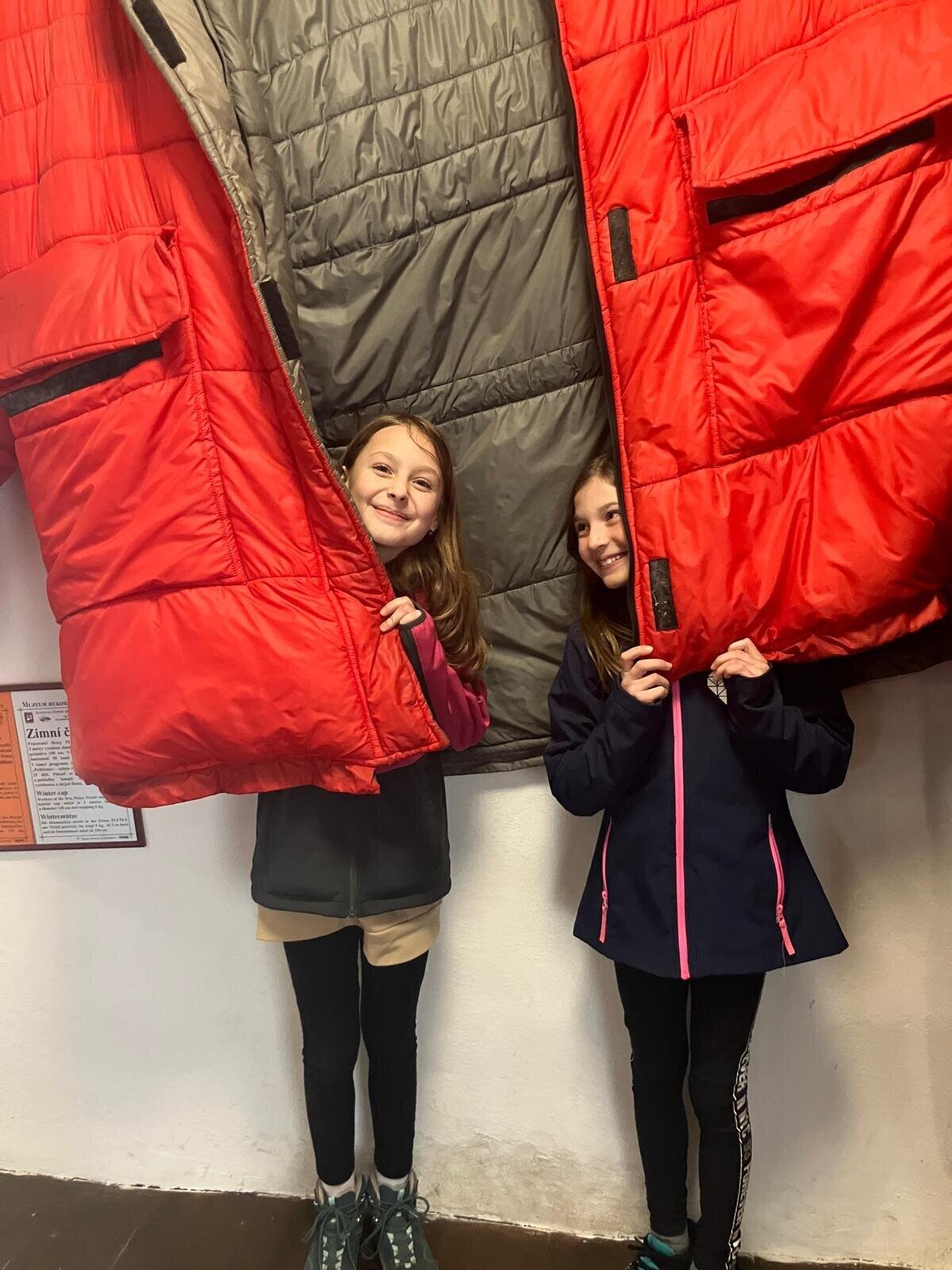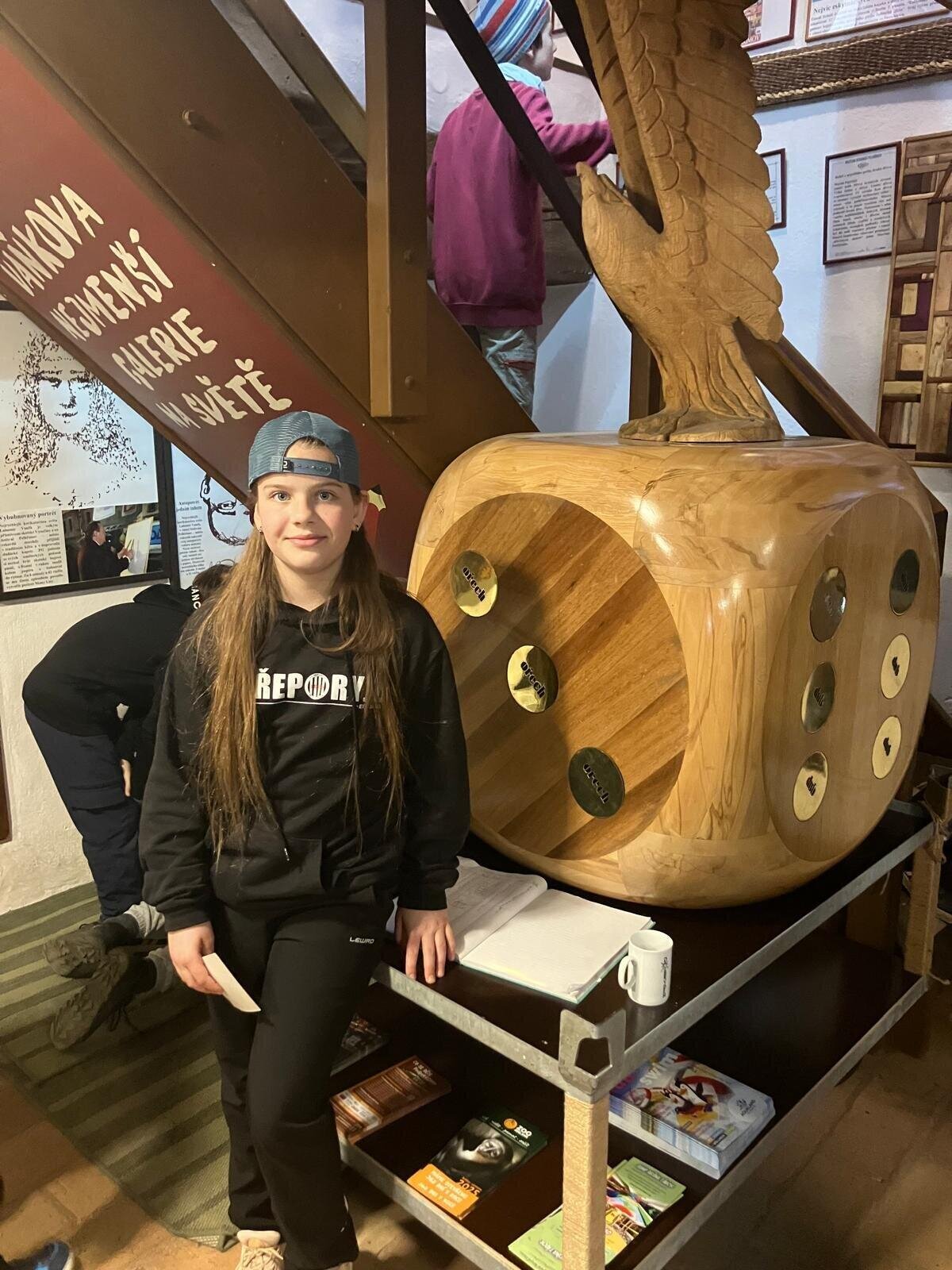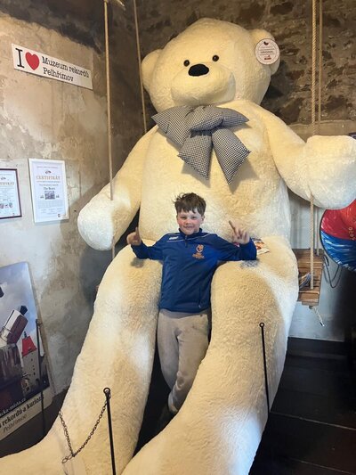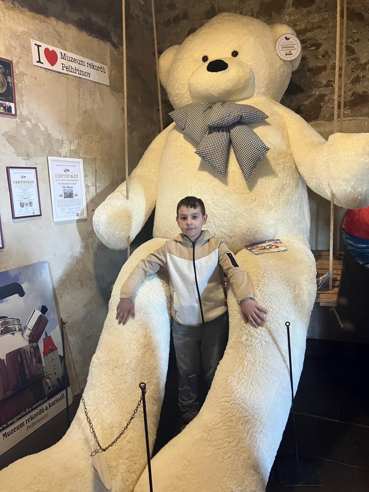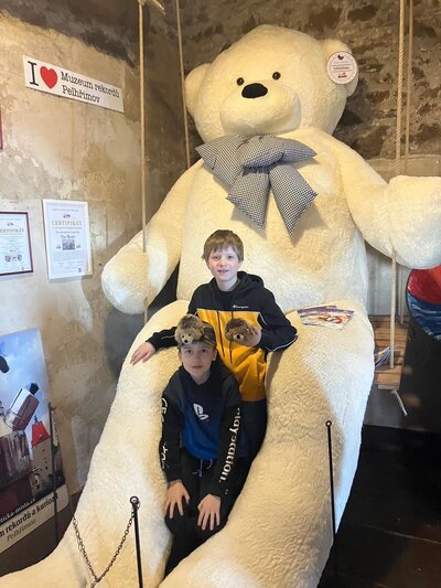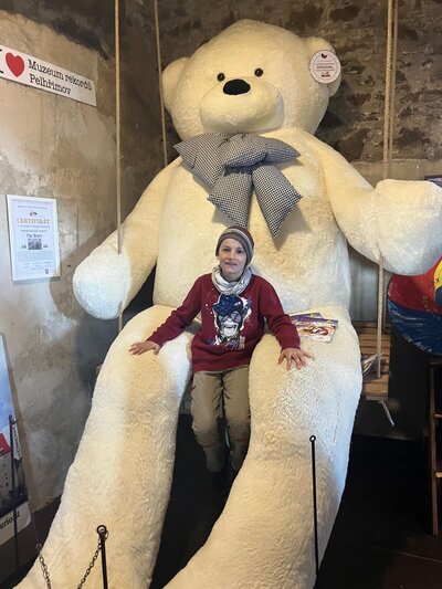 Další část výletu pokračovala ve městě Pelhřimov, kde jsme navštívili Muzeum rekordů a kuriozit. Děti si zde užily spoustu zábavy – házely šišky do obrovského trychtýře, mohly se pomazlit s největším plyšovým medvědem, prohlédly si hudební nástroje vyrobené ze zápalek a nechybělo ani společné focení s mamutem. Výlet byl plný nových zážitků, zajímavostí i dobré nálady a všichni si ho velmi užili.